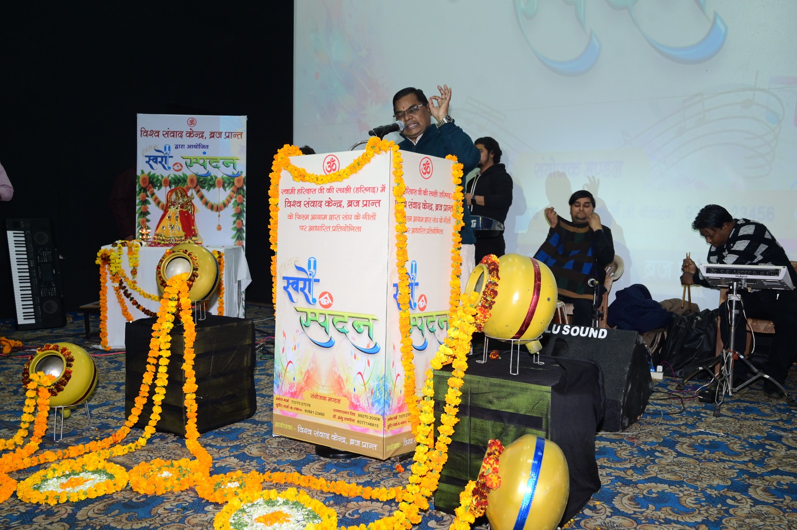‘भारत मां का मान बढ़ाने बढ़ते मां के मस्ताने’ गीत ने पूरे माहौल को देशभक्ति से ओतप्रोत कर दिया। फिर देशभक्ति गीतों का सिलसिला शुरू हुआ तो शाम तक हर कोई मंत्रमुग्ध होकर सुनता रहा। गीतों में सुर सधे तो सुर गंगा की धार बह उठी। प्रथम, द्वितीय, तृतीय वर्ग के 70 प्रतिभागियों ने प्रतिभाग किया। मुख्य वक्ता आरएसएस के पश्चिमी यूपी के क्षेत्र प्रचार प्रमुख पदम सिंह ने कहा कि इस हरिगढ़ की भूमि से स्वामी हरिदास जी के नाम पर एक नया उद्घोष, उस ध्वनि का गुंजायमान इस संपूर्ण देश, विश्व के अन्दर आज हो चुका है। किसी कवि ने कहा है कि शब्द जोड़ते हैं, शब्द तोड़ते भी हैं, शब्द बिगाड़ते हैं और शब्द संवारते हैं। तो कौन से शब्दों की बात कर रहे हैं हम? संगीत के शब्दो की बात कर रहे हैं। इस भारत के काव्य के अन्दर दो विधाएं ऐसी आयीं – संगीत और नाटक। ये दोनों विधाएं व्यक्ति के तन और मन दोनों का समन्वय करके, दोनो को एक निर्माण की दिशा में अर्थात उन शब्दों को साथ लेकर ये गीत और नाटक जो मंच पर किया जाता है, वह सीधे-सीधे हृदय को स्पर्श करता है और हृदय और आंखें किसी दृश्य को देखती हैं तो वह दृश्य लंबे समय तक उस व्यक्ति को अपनी ओर से हटने नहीं देता है। शब्द भी वही काम करते हैं, संगीत भी वही काम करता है। यह संगीत व्यक्ति को व्यक्ति से नहीं, व्यक्ति को समाज से जोड़ता है। व्यक्ति को देश से जोड़ता है। व्यक्ति को उसकी परम्परा और संस्कृति से जोड़ता है और जब इन सबसे जोड़ने का काम करता है तो एक नयी सृष्टि का निर्माण होता है।